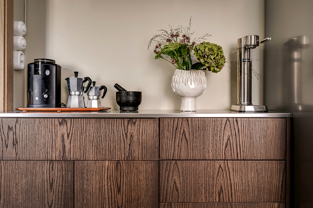 Ett härligt kök med rostfri köksö för umgänge och med fokus på kaffe.
