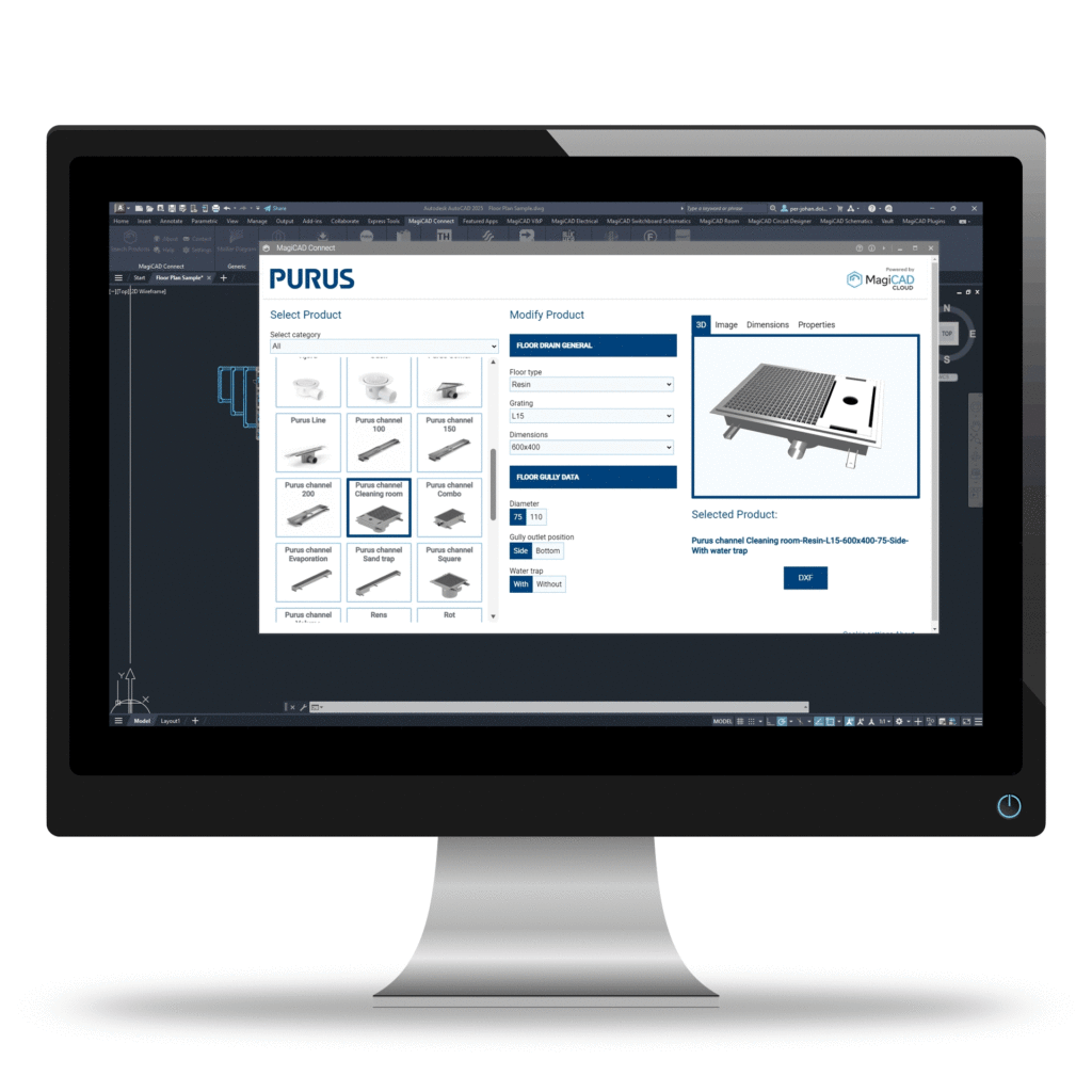 En av de största nyheterna för Purus utbud av rostfria golvrännor i MagiCAD är möjligheten att få ut 3D-objekt i kundanpassade storlekar för flera av sortimenten.