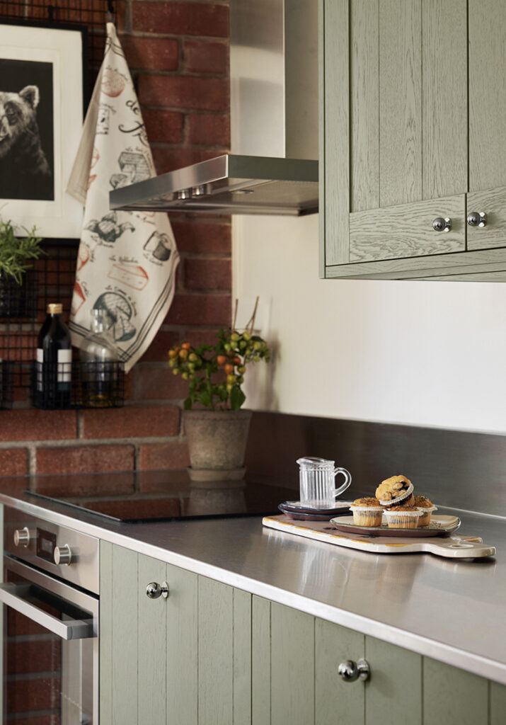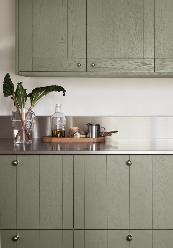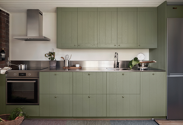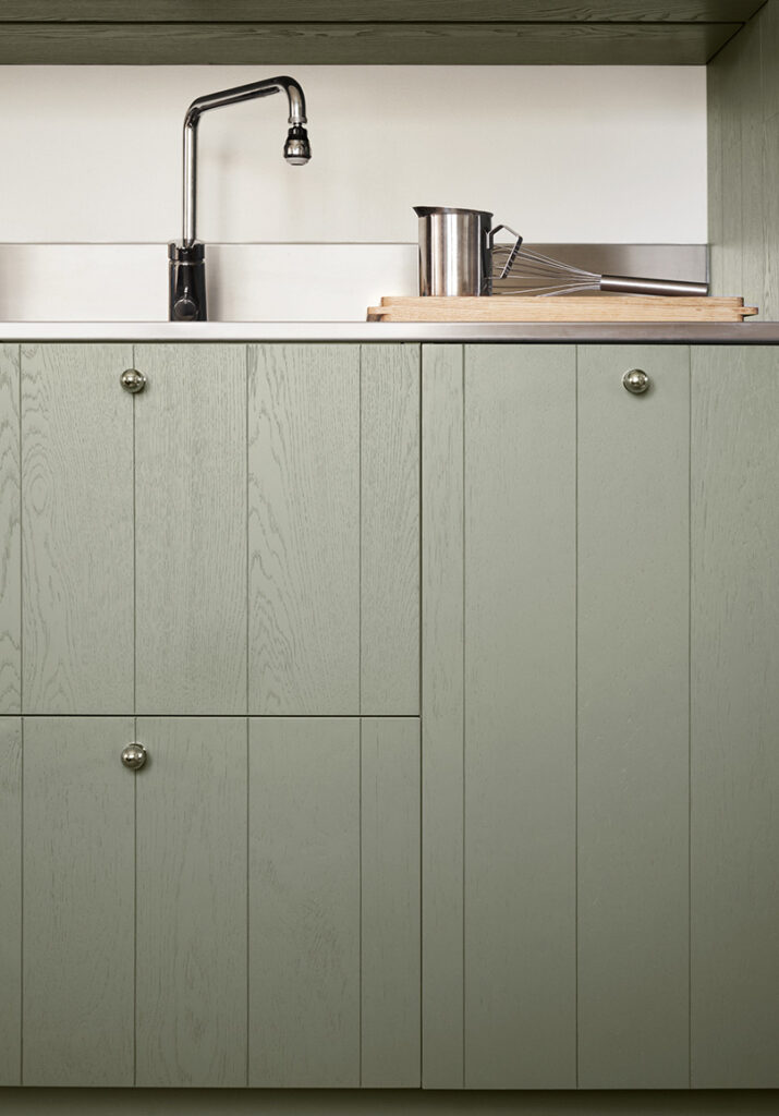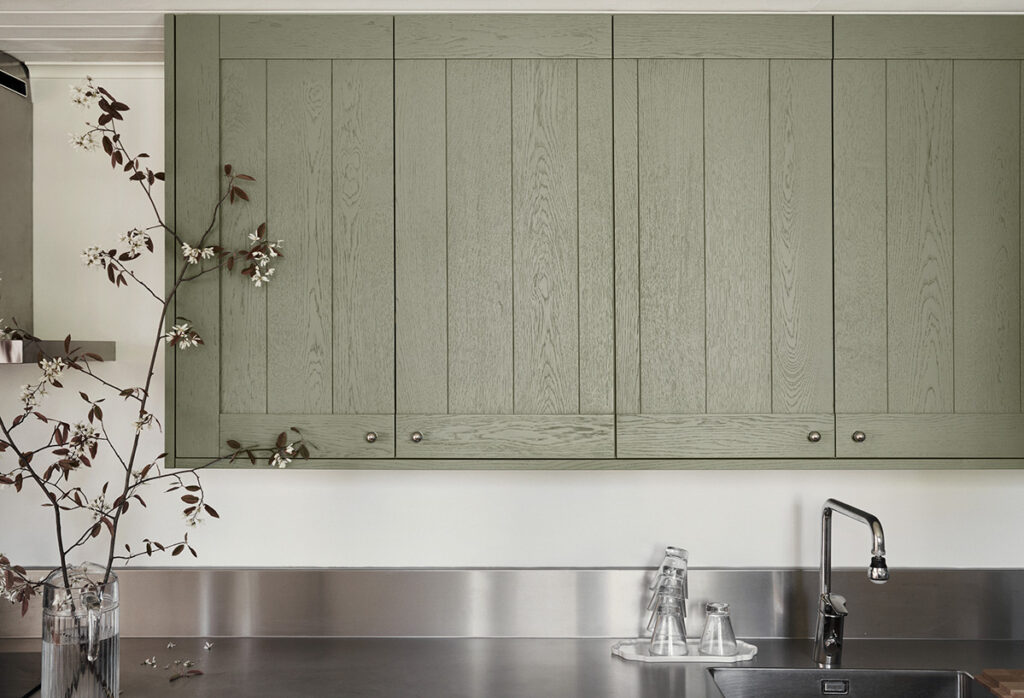 Materialvalen bidrar starkt till kökets karaktär. Luckan PLANK i kraftigt ekfanér med tydlig plankindelning för tankarna till rustik charm men i en modern tappning. Målade ytor ger en elegant helhet, medan färgen Mindful Green tillför en mjuk och harmonisk ton som binder samman alla material.