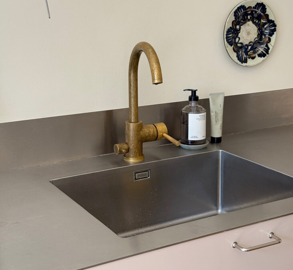 ”Vi valde Purus rostfria bänkskiva – Premium – som är en solid 4 mm tjock plåt tillsammans med en stor diskho (en Astris 540 för den som är nyfiken). Det visade sig att jag tydligen är en person som får gåshud av att diskon är integrerad. Det är så tillfredsställande, jag blir alldeles tossig!