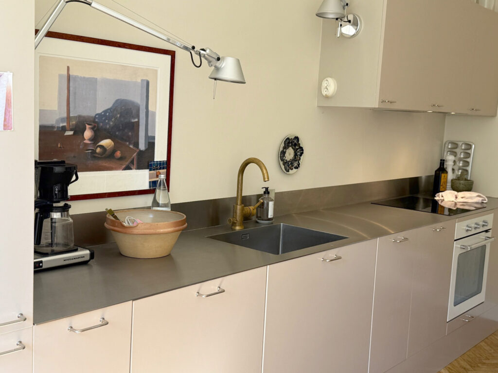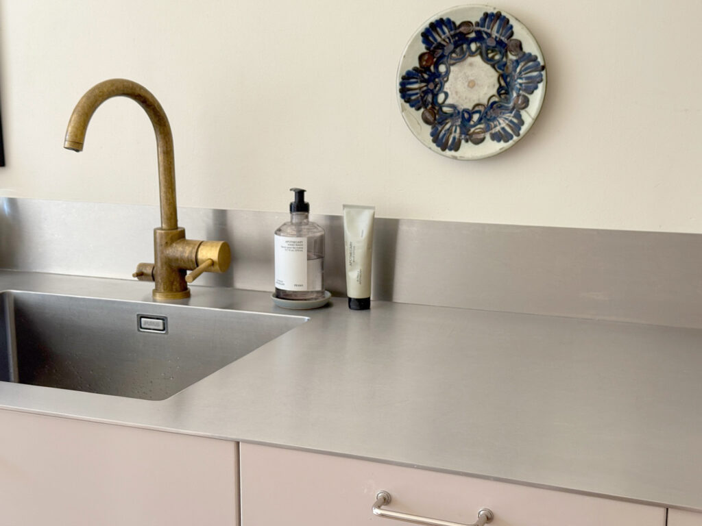 ”Man kan absolut dra argument som hållbart och tidlöst, men den främsta anledningen till att vi valde en rostfri bänkskiva från Purus var av estetiska skäl. Vi ville få till en modern, luftig känsla utan att riva hela köket, och bänkskivan blev verkligen det som gjorde hela skillnaden. Jag älskar att den nästan ser ut att sväva. Vi ville hålla det öppet och ljust. Eftersom jag lagar mycket mat och fotar i köket var det också viktigt att ytan är tålig och snygg.”