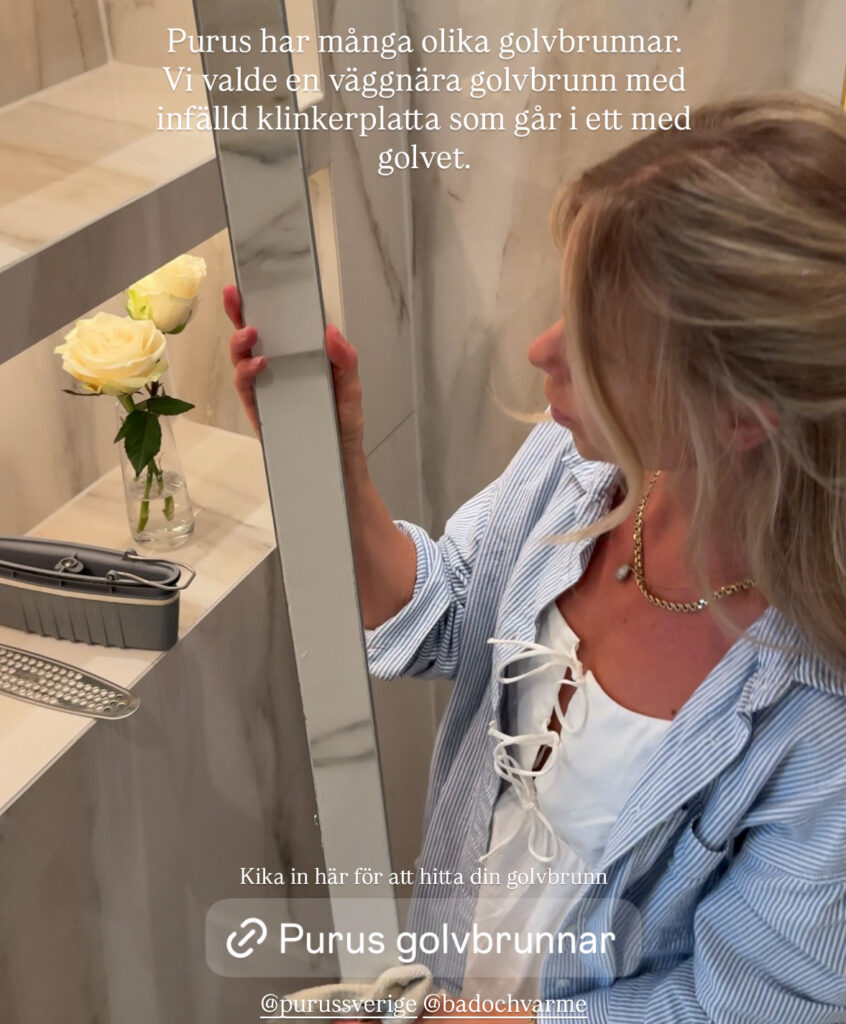 Golvbrunnsvalet för duschutrymmet föll på en väggnära golvbrunn av modellen Purus Line. Att det blev så var tack vare möjligheten att använda samma klinker som på golvet i klinkerramen, och därmed göra golvbrunnen näst intill osynlig genom att få den att smälta in i golvet. Endast en smal avrinningsspalt avslöjar var golvbrunnen är placerad.