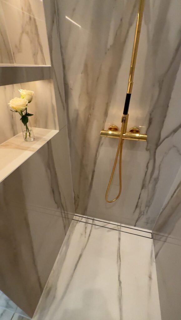 Den väggnära lösningen gör det även möjligt att använda stora plattor hela vägen in i duschen, utan kuvertskärning. Fallet kan istället läggas i en riktning, in mot väggen, vilket ger ett jämnare golv att stå på och ett otroligt snyggt sömlöst helhetsintryck.
