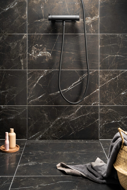En fördel med väggnära golvbrunnar är att du har möjlighet att välja stora plattor hela vägen in i duschen. Med en linjär golvbrunn blir det nämligen inte blir så komplicerat att få till golvfallet, eftersom plattorna inte behöver skäras till i mindre bitar, så kallad kuvertskärning, som man normalt behöver vid en centrerad brunn. Utan här läggs plattorna med lutning åt ett och samma håll, in mot väggen.