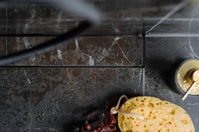 Trenden med jordnära kulörer har fått breda ut sig i detta privata badrum med fokus på detaljerna. Purus PRO Line Premium ger en näst intill osynlig golvbrunn som smälter in i duschutrymmet. De vackra keramiska plattorna med levande, diskret mönstring skapar ett lugn med mörkbruna toner.