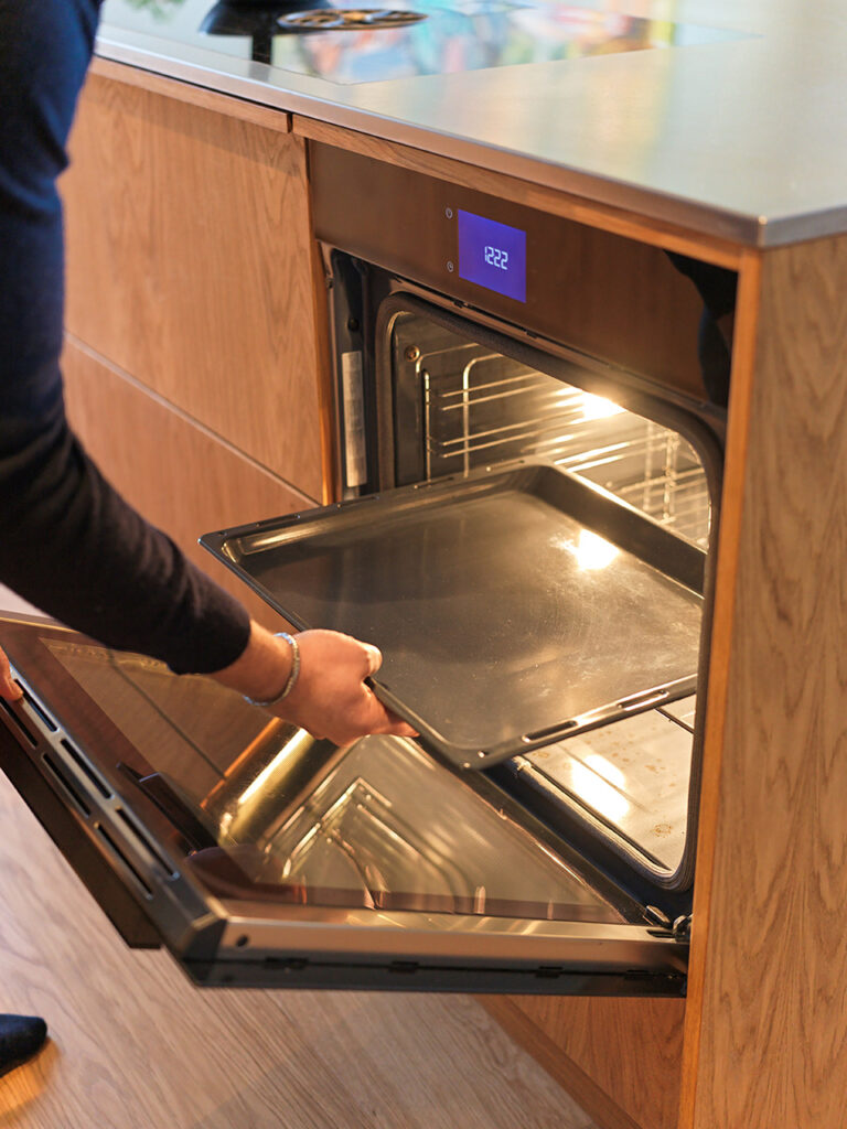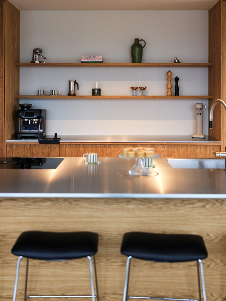 Mötet mellan rostfritt och trä upplevs mjukare än väntat. Kombinationen känns inte kall, utan snarare balanserad, skandinavisk och tidlös. Ett kök som är tänkt att fungera lika bra idag som långt fram i tiden. Med åren kommer bänkskivan få sin naturliga patina och bära spår av vardagen, något som bara gör helheten mer levande.