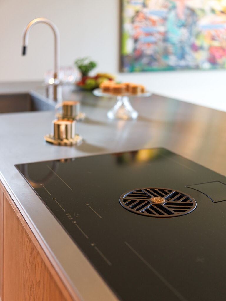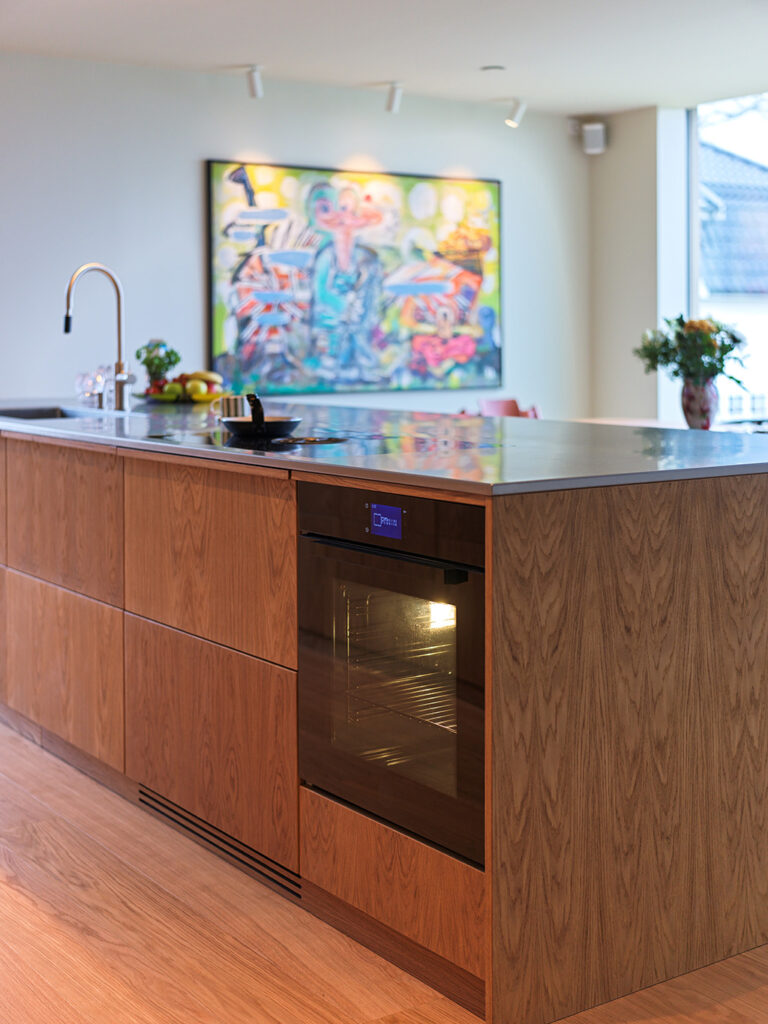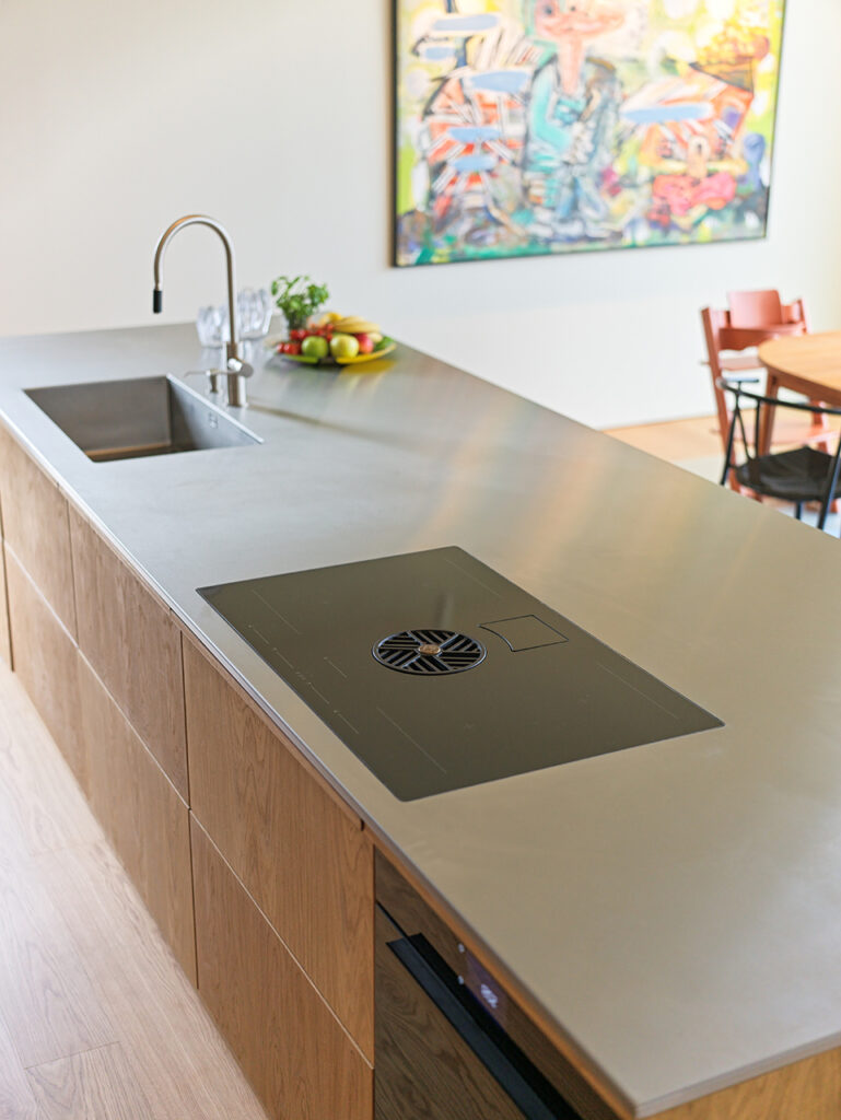 Den tunna skivan bidrar med ett precist och arkitektoniskt uttryck. Eftersom köksön är så central blir bänkskivan ett naturligt blickfång, och något som ofta kommenteras av gäster.