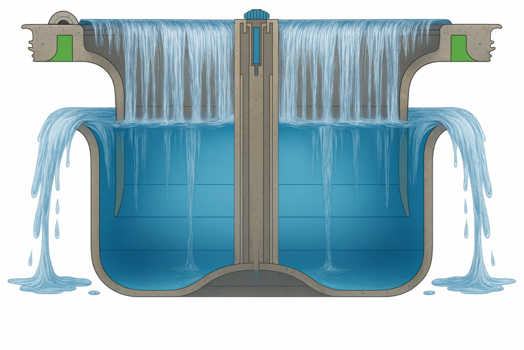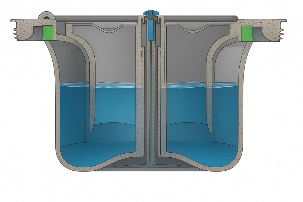 Vattenlåset är en av de centrala delarna i en golvbrunn. Du ser det när du lyfter av silen. Det förhindrar att dålig lukt, fukt och gaser från avloppssystemet tränger upp i rummet. Tätningen skapas av en liten vattenficka som fungerar som en barriär mot oönskad lukt – en enkel men avgörande detalj för en frisk inomhusmiljö.